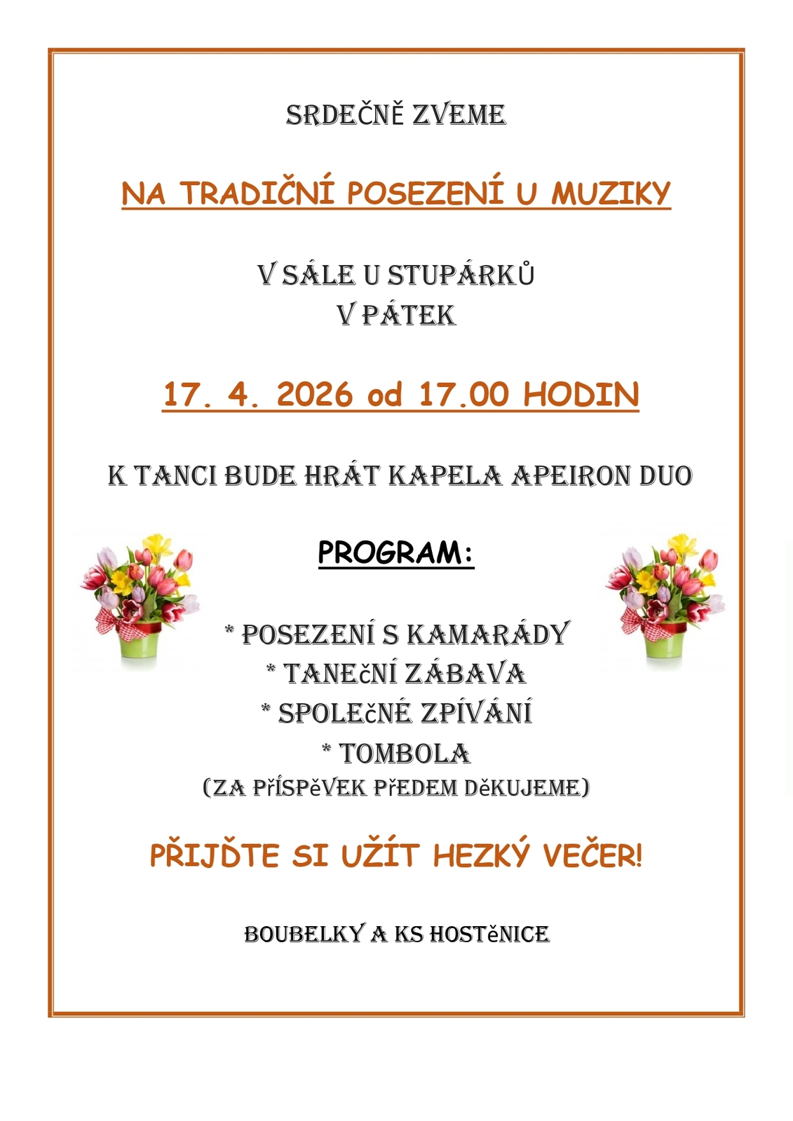 tradiční posezení u muziky v pátek 17.4.2026 od 17.00 hod.